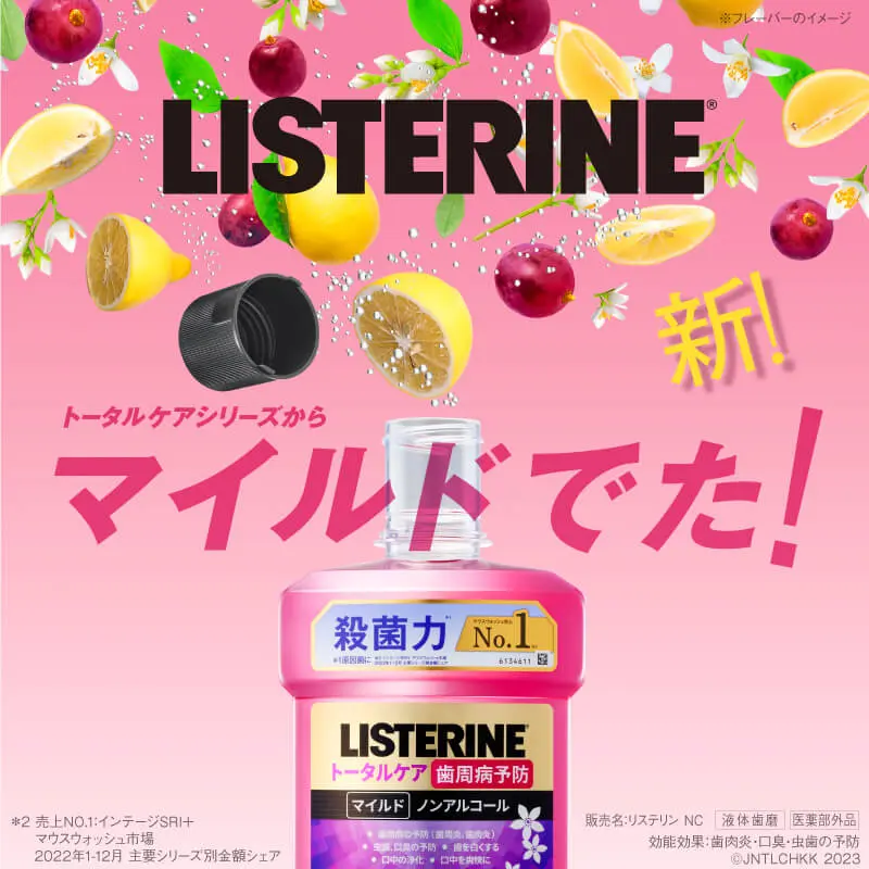洗口液 | 医薬部外品,4つの薬用成分を含むリステリン独自処方が、歯磨きでは届きにくいお口の隅々まで行き渡り殺菌、口内を清潔に保ちます。甘めミント味。