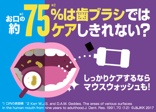 通常の歯磨きだけではケアしきれない口内表面積の約75%*(舌や歯ぐき、口腔粘膜など)には薬用マウスウォッシュの併用がおすすめ!