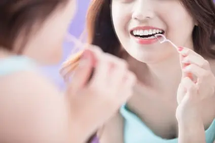 歯ブラシで取りきれなかった歯間の汚れを掻き出します。歯に対して斜めに構え、ゆっくりと前後させながら歯間に少しずつ挿入していきます。そして、歯の側面をこするようにフロスを動かしてキレイにしていきます。